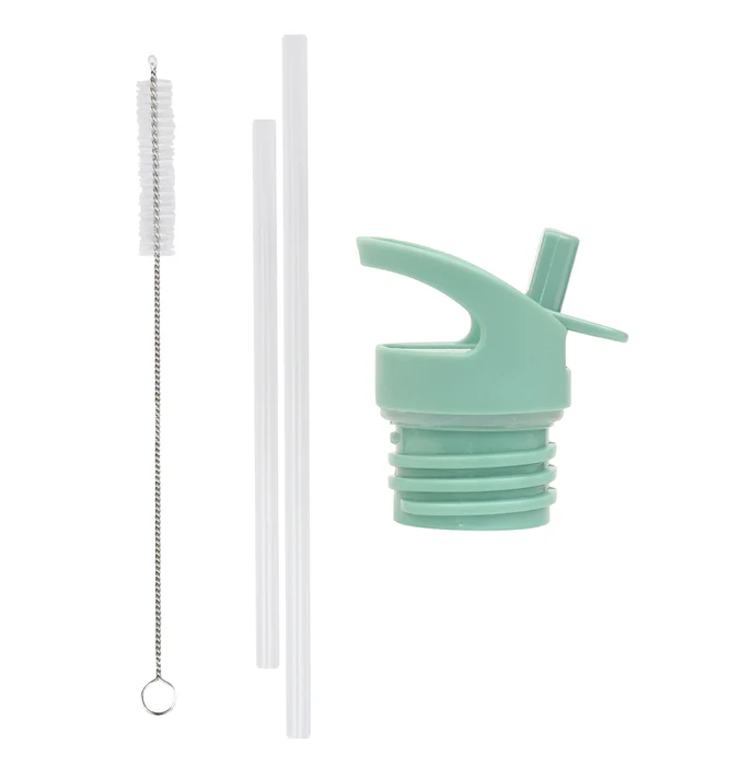 Set, bestaande uit een dop, rietje en borstel voor de 350 ml roestvrijstalen drinkfles van A Little Lovely Company.