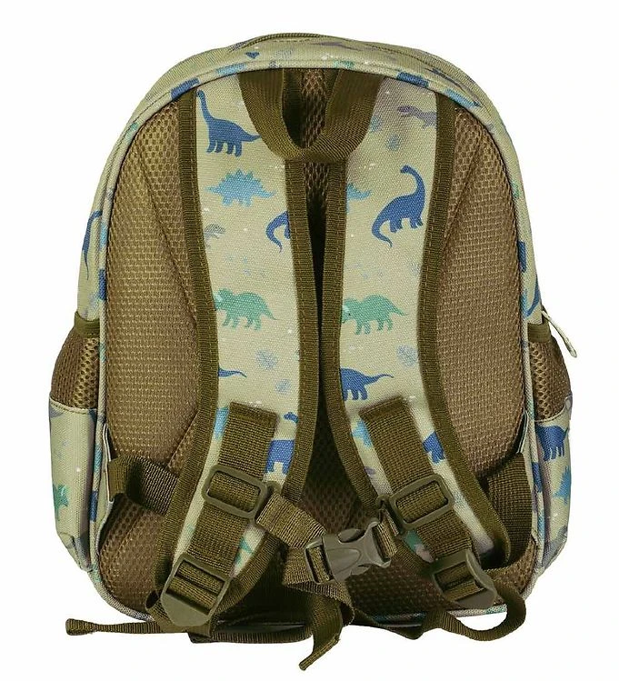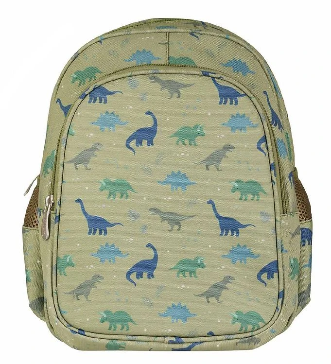 Mooi A Little Lovely Company kleuterrugzak in de groen met een allover print van stoere dino’s. Aan de zijkant bevindt zich een wit applicatie met de naam van het merk.