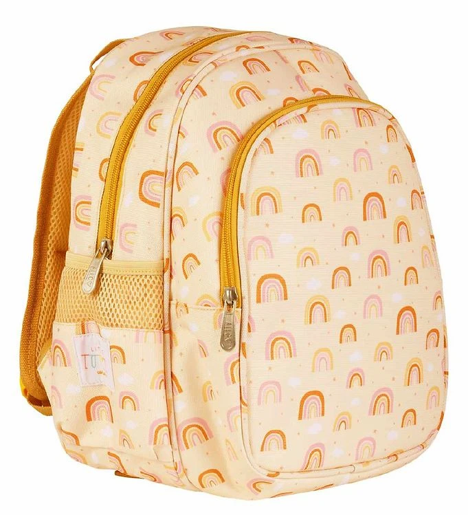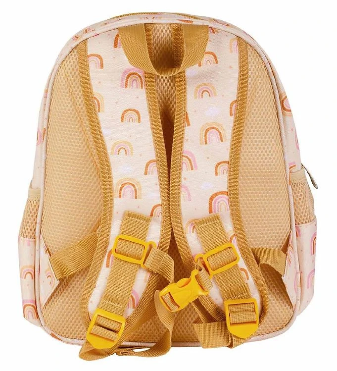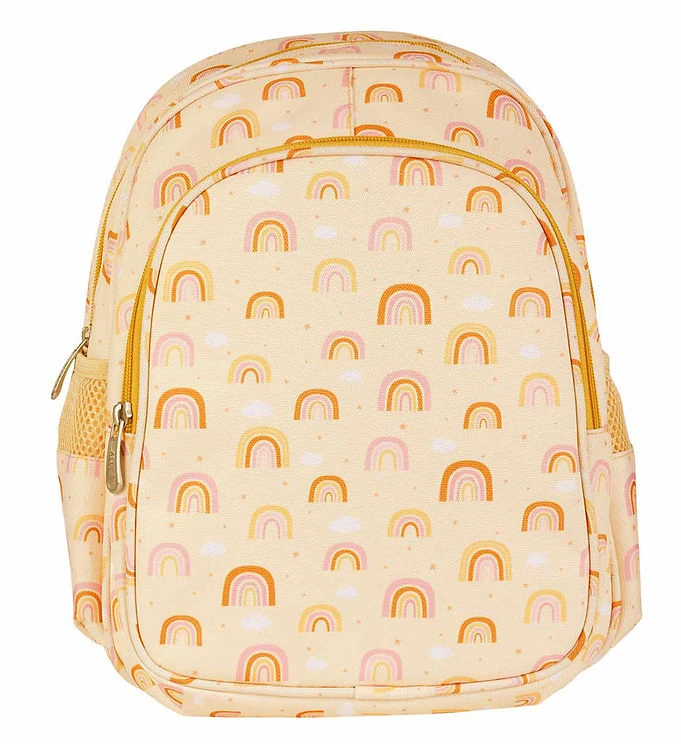 Mooie crème kleuterrugzak van A Little Lovely Company met een allover print van regenbogen in okergeel en roze en wit wolken. Aan de zijkant bevindt zich een wit applicatie met de naam van het merk.