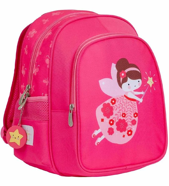 Mooie roze kleuterrugzak van A Little Lovely Company met een groot, mooi fee op de voorkant. Aan de zijkant bevindt zich een wit applicatie met de naam van het merk.