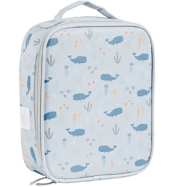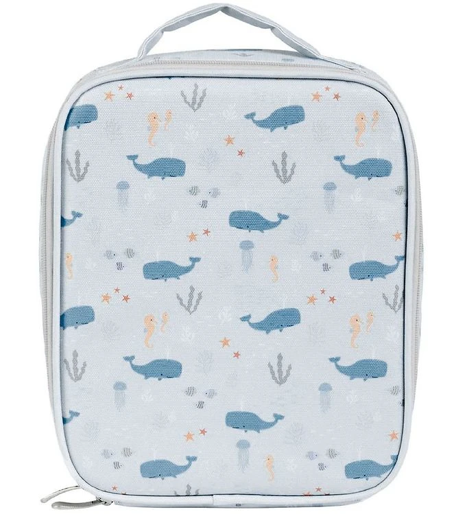 Mooi A Little Lovely Company koeltas in lichtblauw met een allover print van walvissen, zeepaardjes, zeesterren, drinkbekers, vis, zeewier en koralen in de tinten blauw, groen, geel en rood. Aan de linkerkant van de tas zit een mooie applicatie.