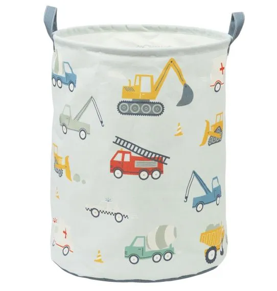 Deze grote katoenen opbergmand met voertuigen-print is ideaal voor het opbergen van speelgoed in een baby- of kinderkamer. Je kleintje kan na een dag spelen alle spullen oppakken en hierin opbergen en gemakkelijk verplaatsen dankzij de twee handgrepen. De opbergmand heeft een beschermende PE-coating aan de binnenkant zodat hij ook als wasmand kan worden gebruikt. De mand zelf kan je plat opvouwen en makkelijk opbergen of wegleggen als hij niet wordt gebruikt.