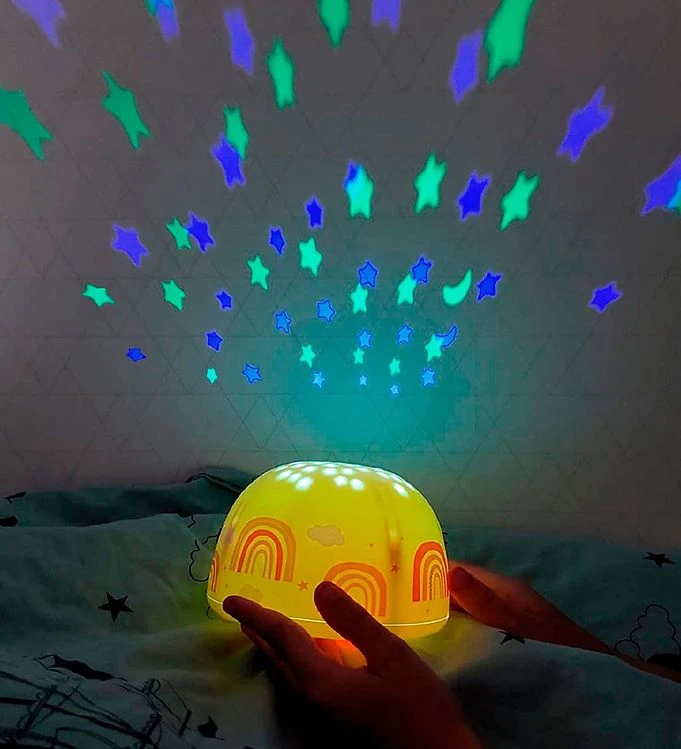 De Lamp heeft een zacht LED licht en verandert van kleur tussen blauw, oranje en groen. De automatische timer schakelt de lamp na 30 minuten uit zodat het kind lekker in slaap kan vallen onder een gezellige sterrenhemel.