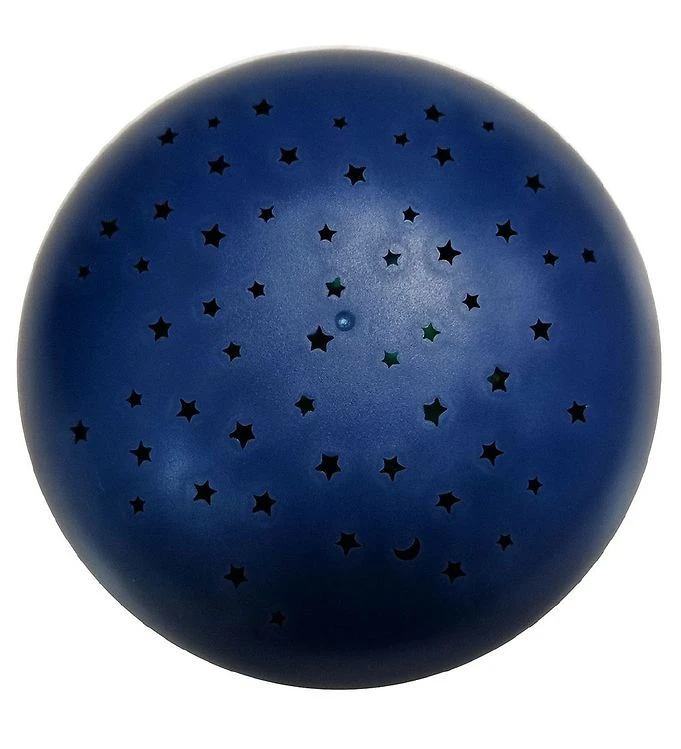 Smart lamp A Little Lovely Company met projectorfunctie, in navy met astronauten, sterren en planeten op de zijkant. De Lamp heeft een rond vorm met bovenop kleine sterren die als lichtgaten fungeren en stervormen naar het plafond projecteren als de lamp aan is.