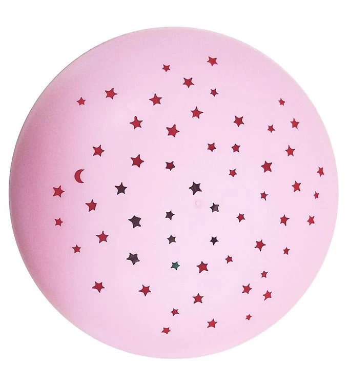Smart lamp A Little Lovely Company met projectorfunctie, in het roze met kleine eenhoorns en regenbogen op de zijkant. De Lamp heeft een rond vorm met bovenop kleine sterren die als lichtgaten fungeren en stervormen naar het plafond projecteren als de lamp aan is.