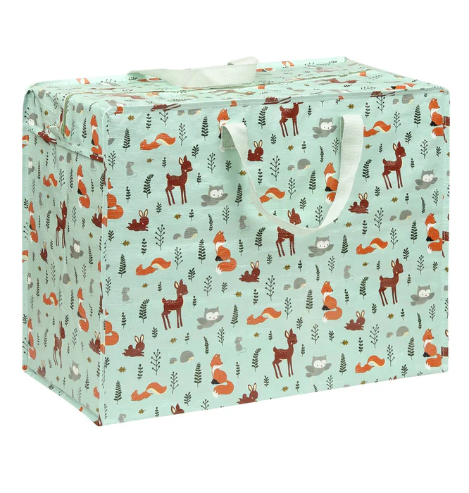 Deze grote mintgroene opbergtas met bosvriendjes print is ideaal voor het opbergen van kleding, dekbedden en speelgoed, maar kan ook gebruikt worden als strand- of zwemtas. De tas is gemaakt van gerecycled plastic en afsluitbaar met een rits. Ook is de tas op te vouwen en hierdoor praktisch om op te bergen.